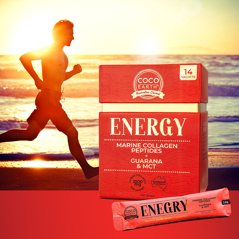 Coco Health Marine Collagen+ Energy 14pk, brought to you by Coco Earth, contains natural bioactive ingredients to help support energy levels, in a convenient single sachet. Serving up a generous 2500mg of marine collagen, paired with Guarana and MCT (medium-chain triglycerides), delivers a potent energy boost by supporting stamina, mental alertness and sustained vitality. With no artificial flavours or sweeteners, enjoy this all-natural mixed berry flavoured drink by just adding water!