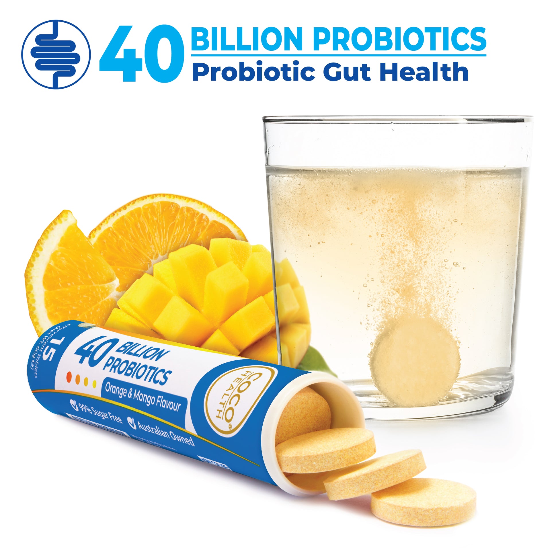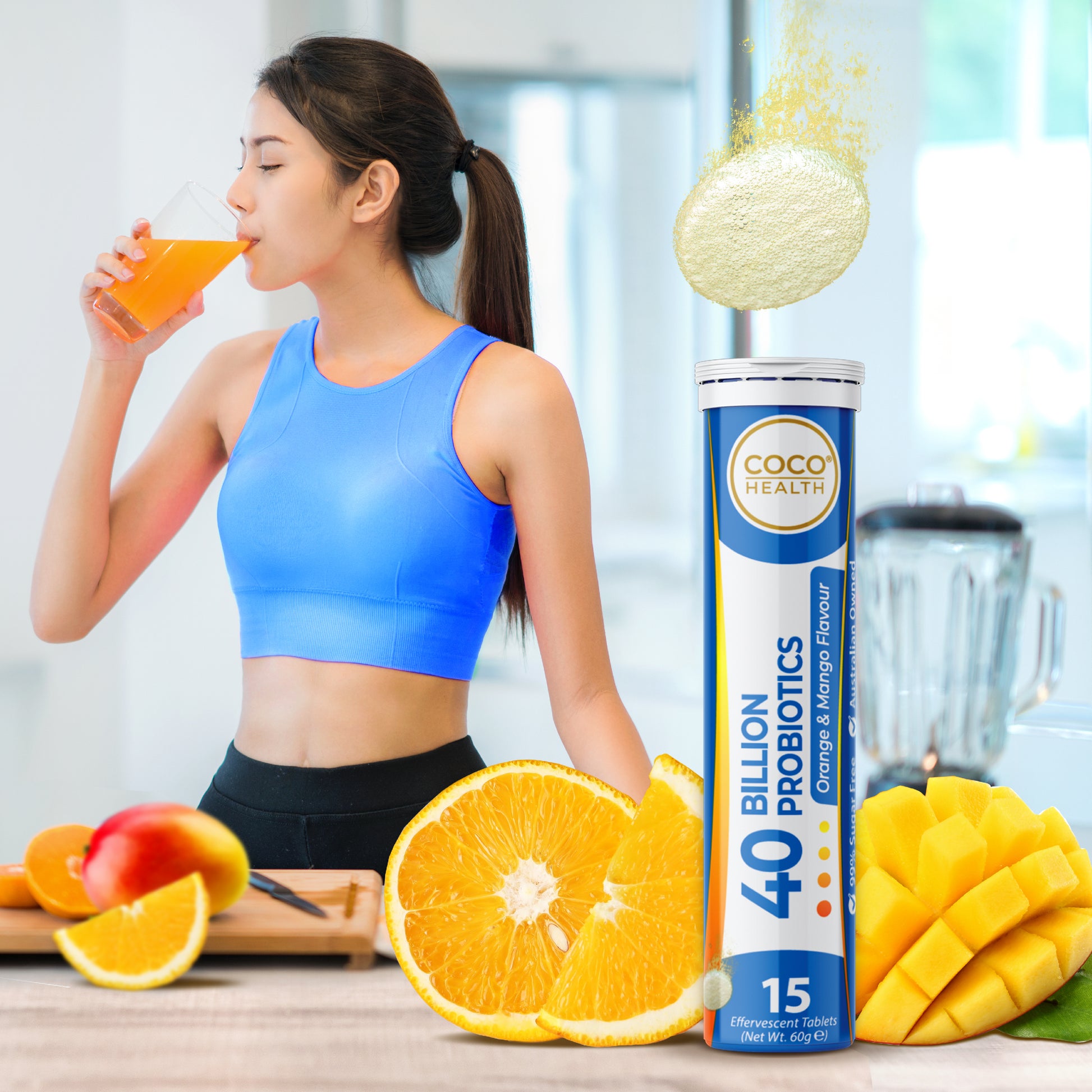 Unleash the power of gut health with Probiotic 40 Billion Effervescent Tablets. These Orange & Mango flavored tablets support digestive balance, gut microbiome health, and boost your immune system. They also improve nutrient absorption, reduce inflammation, aid in weight management, and enhance brain and mood functions.