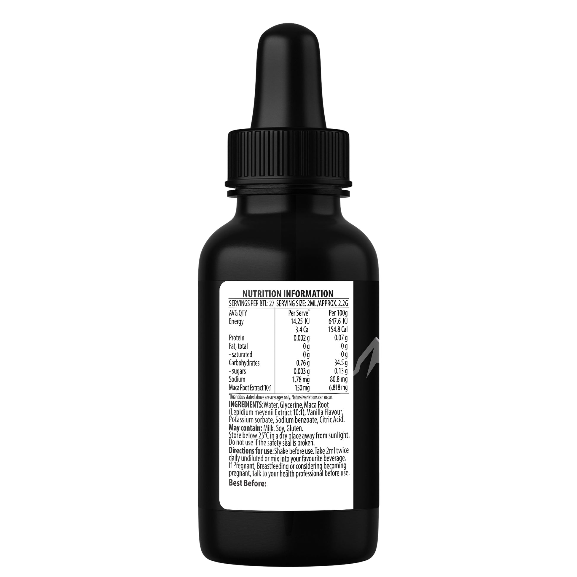 Ingredients : Water, Glycerine, Maca Root (Lepidium meyenii Extract 10:1), Vanilla Flavour, Potassium sorbate, Sodium benzoate, Citric Acid.