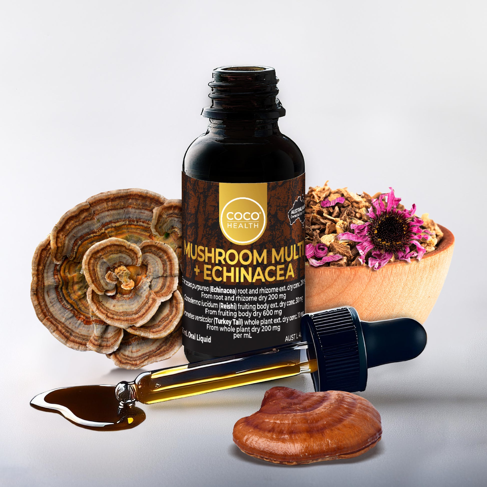 Echinacea is traditionally used in Western herbal medicine to relieve symptoms of mild upper respiratory tract infections and the common cold. It is known to assist in maintaining a healthy immune system function along with Reishi (Mushroom Multi) as a form of anti-oxidant which reduces free radicals that are formed in the body.