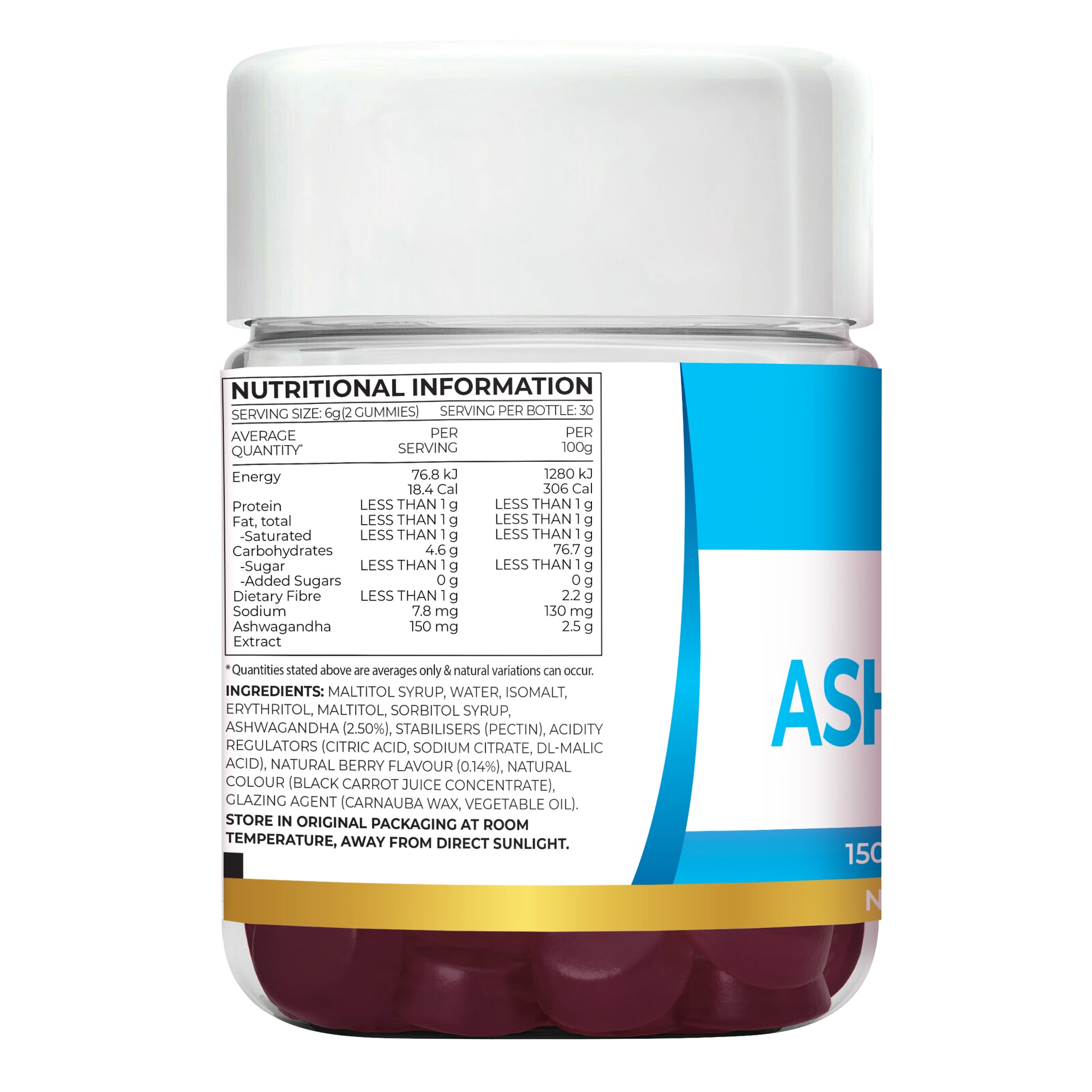 Malt Syrup, Sugar, Water, Acidity Regulators (Citric Acid, Sodium Citrate), Stabilisers (Pectin, Maltodextrin), Ashwagandha Root Extract (2.58%), Natural Berry Flavour (0.6%), Sucralose, Grape Skin Extract, Colour (Natural Carotene), Compound Coating Agent (Carnauba Wax).