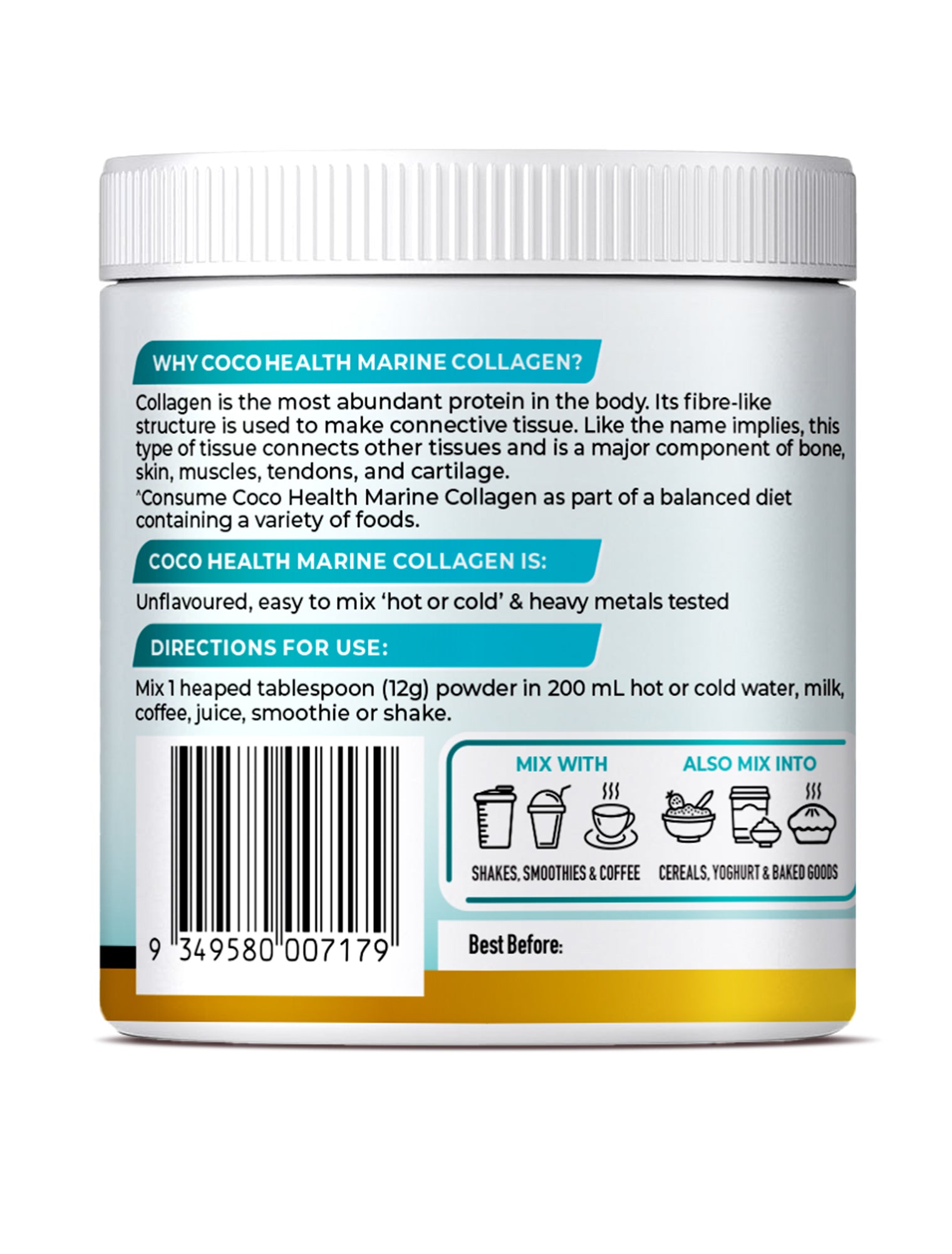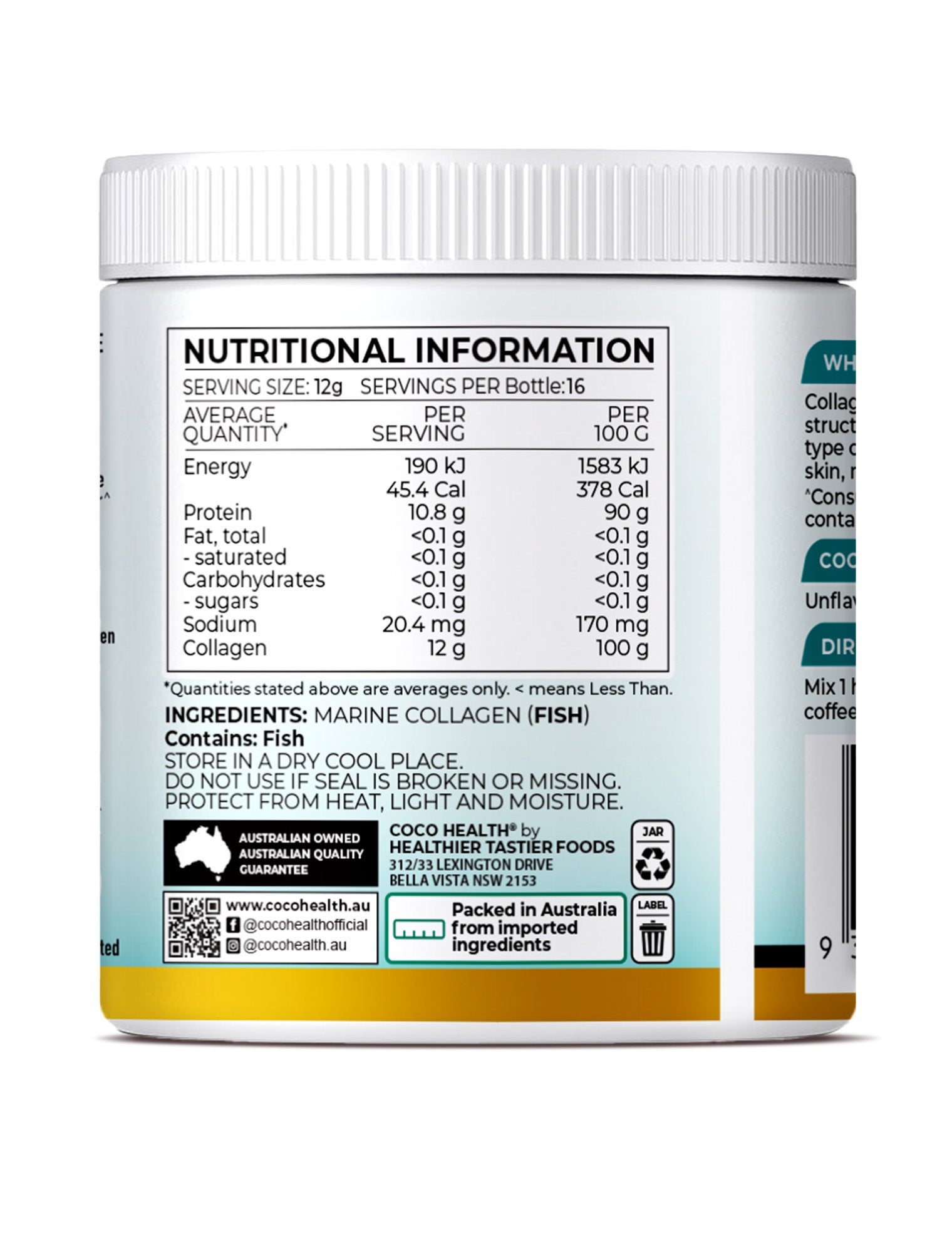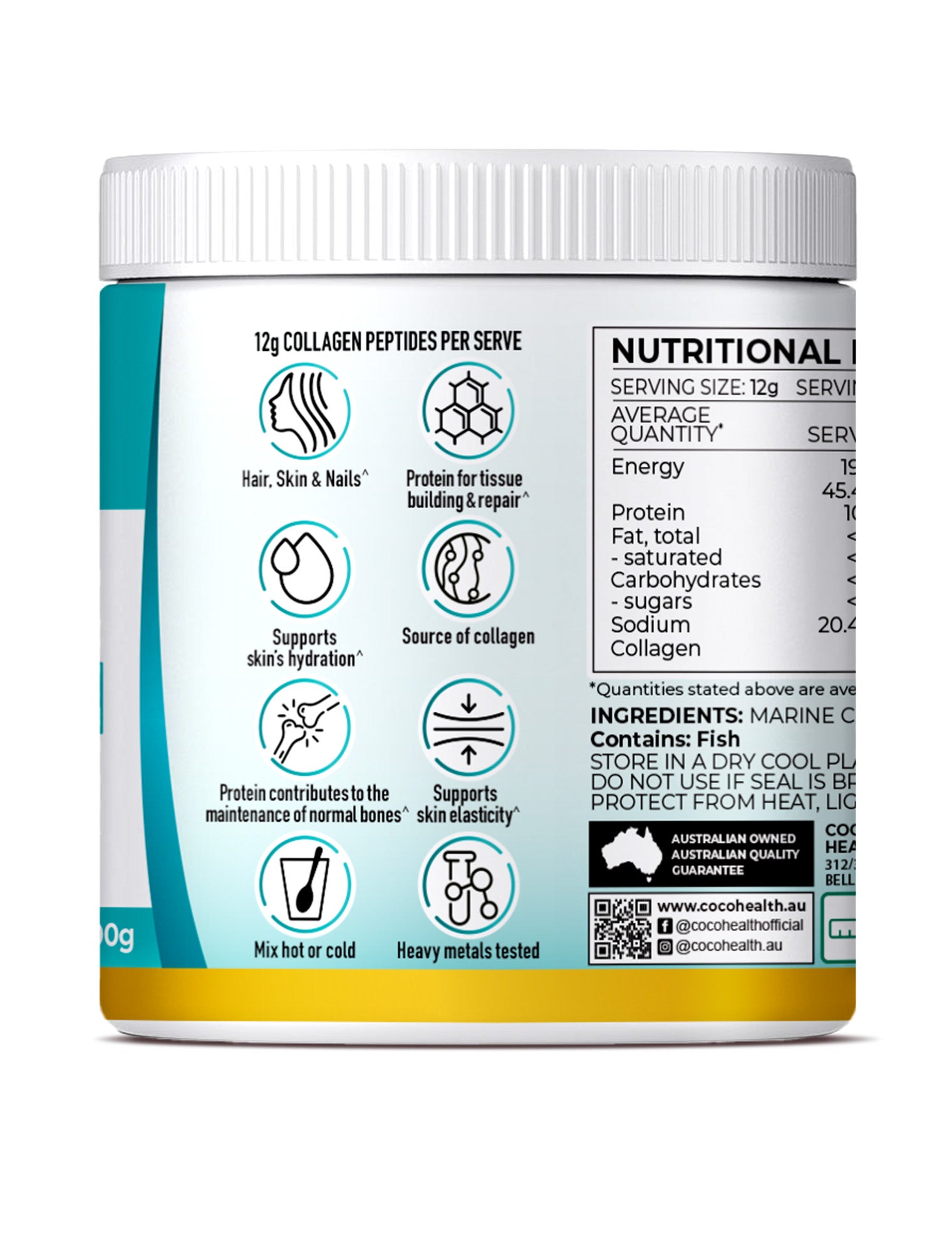 Premium unflavored heavy metal tested high strength Marine Collagen 12g Per Serve. Mix hot or cold in water, shakes, smoothies or coffee.