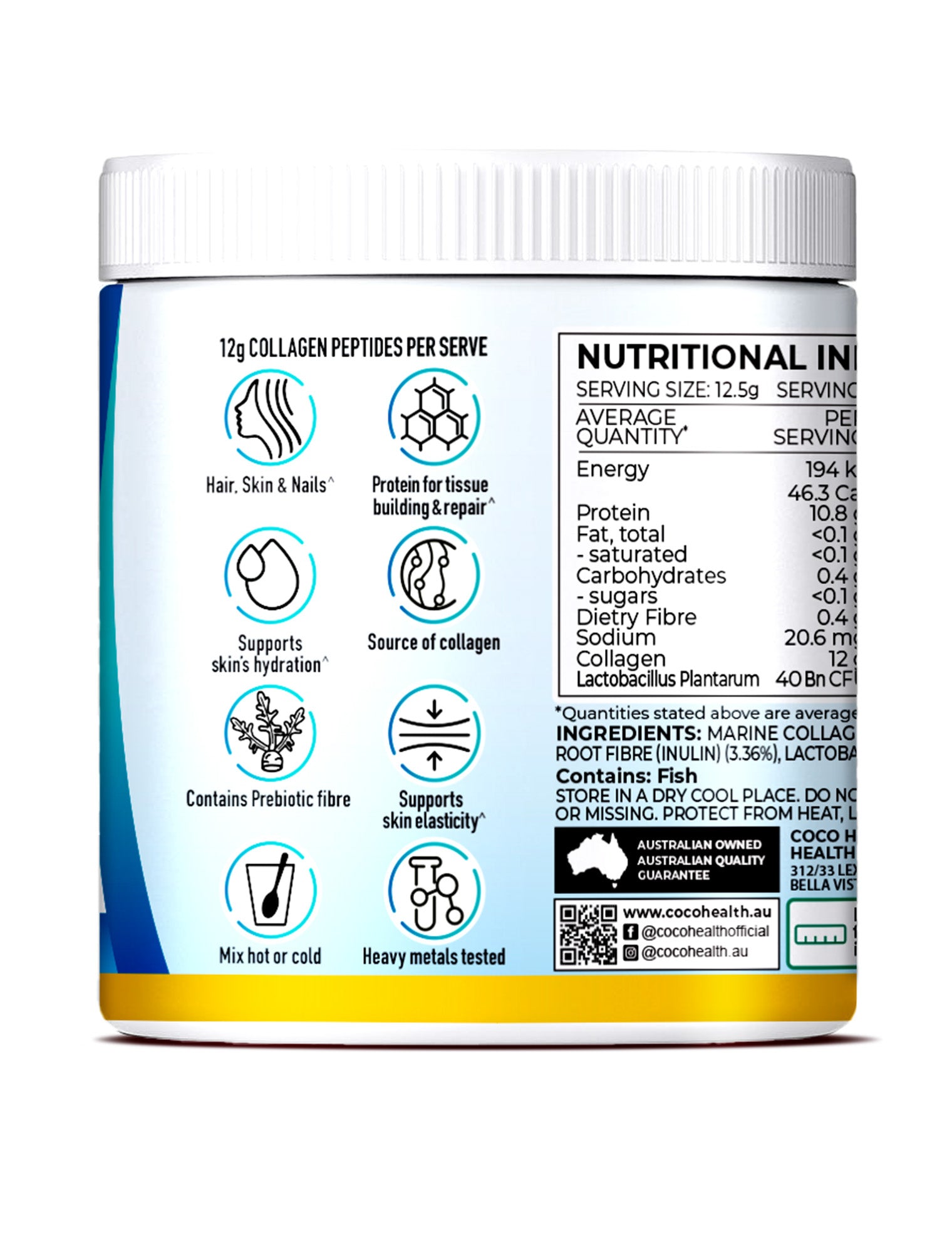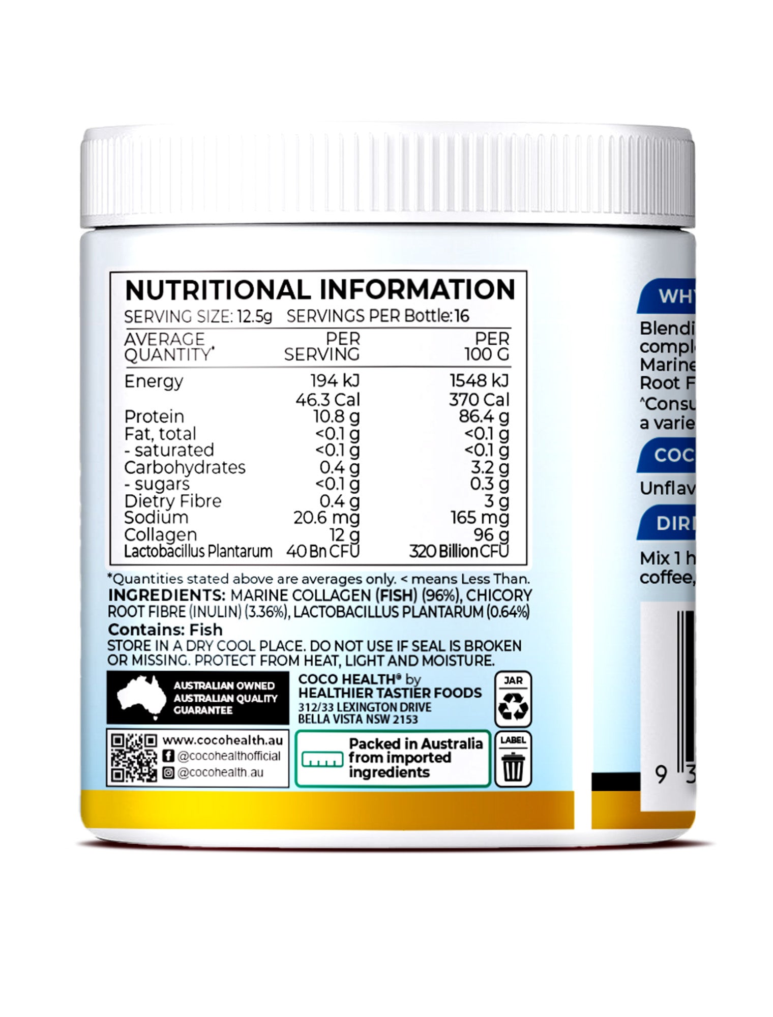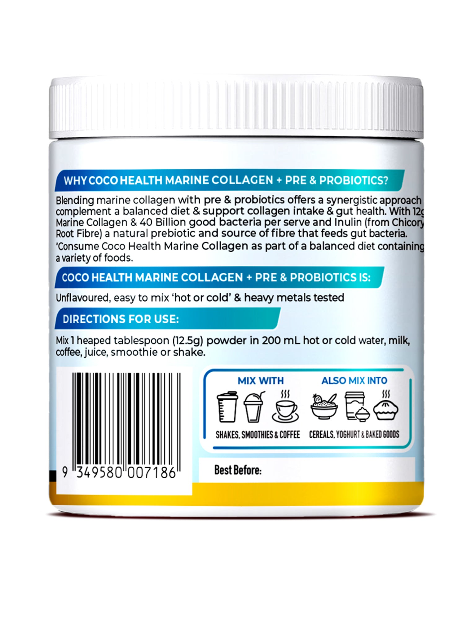 Blending marine collagen with prebiotics and probiotics offers a synergistic approach to complement a balanced diet and support collagen intake and gut health. With 12g Marine Collagen per serve, 40 Billion good bacteria per serve and Inulin (from Chicory Root Fibre) a natural prebiotic and source of fibre that feeds gut bacteria.